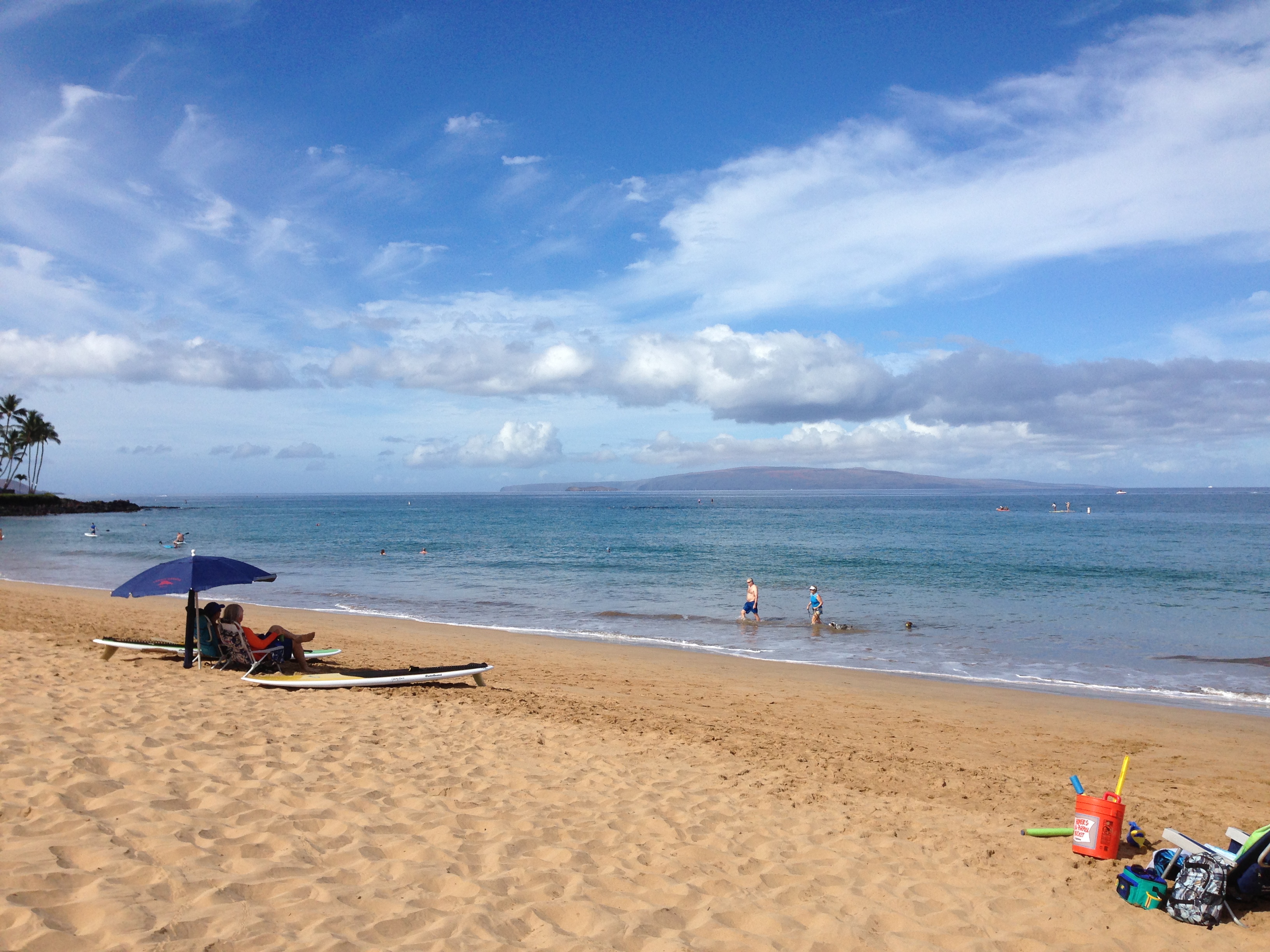 Well, it’s been really perfect lately, what can I say? Such a beautiful Sunday morning out on the water! There was just a breeze blowing from the south and it never let up, but that didn’t stop me. I paddled into the breeze and down to the boat ramp but when I got there, a six-person outrigger canoe was there and everyone from the canoe was in the water snorkeling! The water was a bit choppy, but not too bad. The first turtle surfaced….. and then the second and third…before I knew it I had counted six turtles! I sat between turtle #6 and 7 for a few minutes, then one of the turtles dove down, while the other big one (that had no tail…) drifted towards my board. It was so funny, bumping up against me with its shell! Then suddenly it’s front, left flipper was on my board! Well I just had to rub its shell when that happened…..then it swam back behind me and disappeared. It wasn’t long before turtle #8 and 9 appeared and I got to sit between them too! I was getting ready to paddle back when turtle #10 popped up over near the canoe. That was ten turtles for today! The wind was still blowing from the south, so it pushed me along on my way back. Just as I was about to go for my swim, the wind backed off momentarily and most of my swim was very smooth. The water was very clear today and I saw lots of fish. I saw a Trumpet fish that was so big and fat, that at first I thought it was an eel! Other people saw turtles out in front of Kam I, but it wasn’t my day for that. I was happy with my ten turtles from the boat ramp! What a beautiful Sunday at the beach!!
