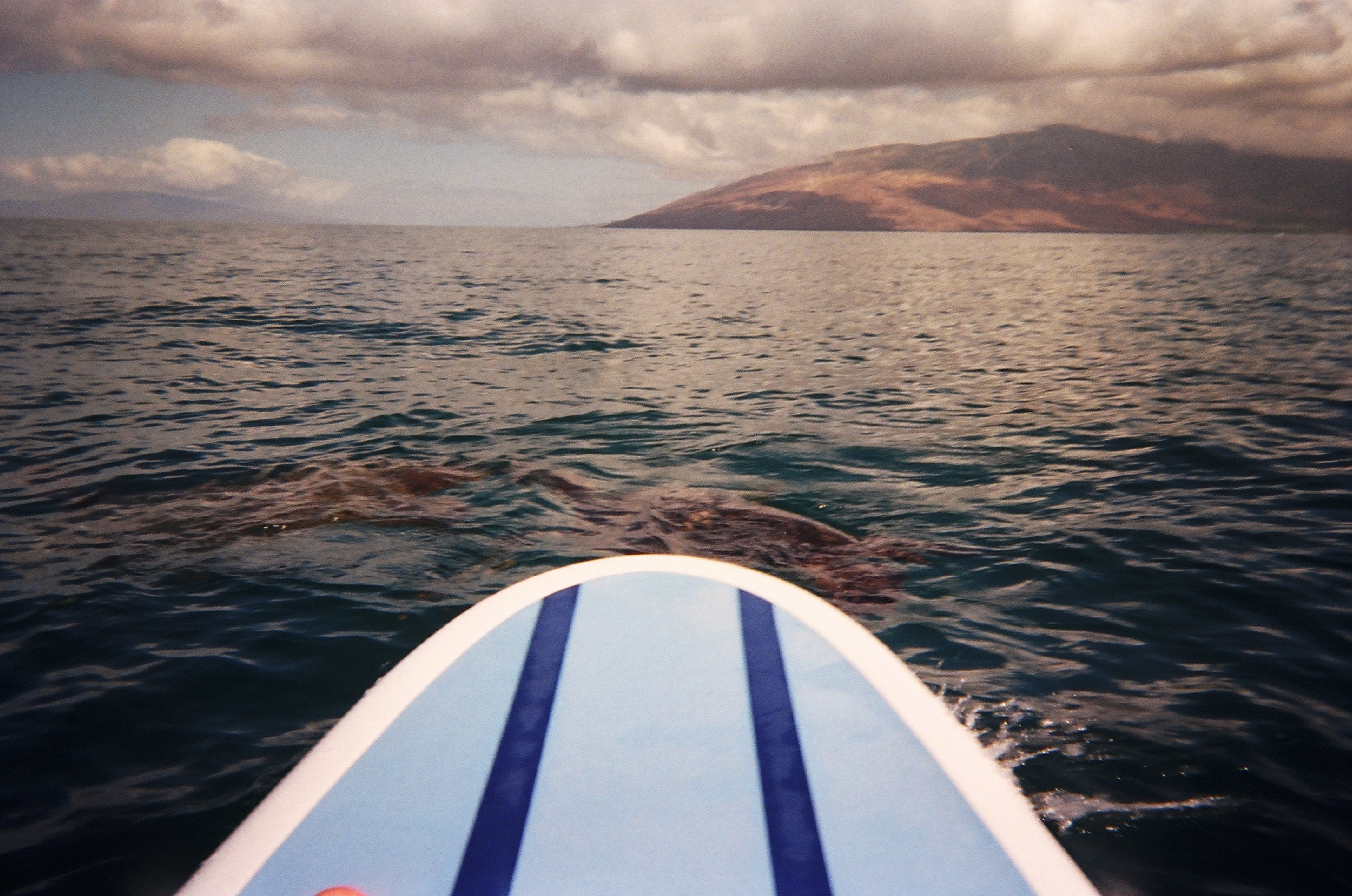 Thank goodness the swell that popped up yesterday was gone this morning and it was a gorgeous day! I had just started out paddling when I saw a turtle under me so I stopped, then another turtle surfaced right next to me. Turtles don’t hang out together or travel in pairs, so I wondered what these two were up to. I watched them circle me and then go under the water facing each other and then back up to the surface next to my board. I soon realized that these two were doing a turtle “mating” dance! After a while, the turtles dove down and I could hardly see them. I guess they wanted their privacy!!! I continued on south with just a comfortable breeze blowing and when I passed Kam III, a big turtle popped up in front of me and then a second turtle joined us! That was four turtles even before I got to the boat ramp! Down at the boat ramp, the turtle day continued with eleven more turtles! I was sitting there in the middle of four turtles when a Coast Guard boat cruised up. I didn’t want them to think I was harassing the turtles, so I laid back on my board with my paddle laying across my hips so they could easily see that the turtles were choosing to be there by their own choice! There is a fine possible if someone is harassing the turtles, but they could see that I was not doing that, so they moved away and left. Too bad the Coast Guard is never around when snorkelers are chasing the turtles! Anyway, the conditions stayed perfect as I paddled back and all the way through my swim. Even the water visibility was improved from yesterday and I saw a school of about twenty blue and silver fish dart by and saw quite a few fish at the reef too. It was just a gorgeous day with the wind holding off making it a perfect day in the water! Woo Hoo!!