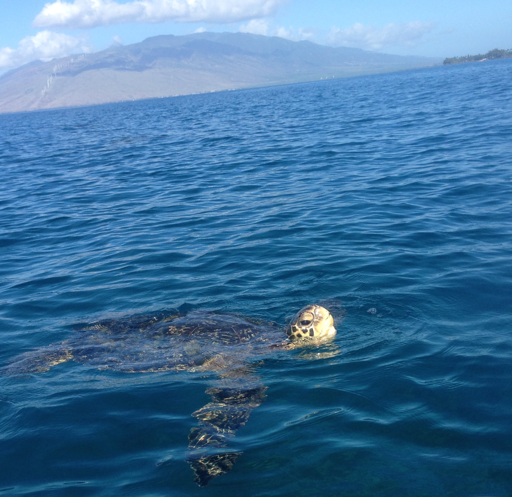 I got out late again today…..but it was so perfect! I paddled straight down to the boat ramp. On the way, I ran into a paddling friend and she said she had seen a lot of turtles already! She was right! Immediately we had six turtles all at once surrounding us! Then there were four more surfacing and I got some photos! Bumpy was among the turtles for today too. It was so perfect and so many turtles, but then the red snorkel boat roared in and all the turtles disappeared. I heard the snorkelers saying all the turtles were on the bottom….probably hiding out! My friend and I started to paddle north when there was a huge splash out farther! My friend said it looked like a huge manta ray that shot right out of the water and dropped back in! We have been on the look out for whales lately but hadn’t seen any yet. The conditions stayed perfect all the way back and just got a little windy from Kam 2 to Kam I. The water is very clear right now so I am really enjoying all the fish down at the reef. I followed two large Puffer fishes around for a while and saw a lot of new little tropical fish hanging around the recently exposed reef. It was just a beautiful day…..I hope it’s this nice tomorrow too! Later I did see two whales spouting out from Kam 2 too, so maybe they are going to start coming in closer to shore…….