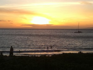 I got out earlier today and decided to bring my mask and snorkel. It was a beautiful morning, but the ocean was not glassy like yesterday, in fact, there were some small rolling swells from the north. When I got down near Kam II, I ran into a paddling friend, so we paddled down to the boat ramp together. She brought her mask too, so we hoped to do some snorkeling. When we arrived at the boat ramp, I spotted one turtle. Before we knew it, more turtles surfaced! I was trying hard to count, but when I got to 12, I lost count. They were all around us, and just about the time I said I like it when I am surrounded by turtles, 7 or 8 popped up all at once and we were surrounded alright! There were big turtles, small turtles and about every size in between, all swimming around us, popping their heads up and swimming under us. It was so great! There were a few other paddlers in the area and they must have seen our turtle fest, so pretty soon there were joining us. There ended up being about ten of us, all women, and the turtles kept swimming around! Then I paddled over closer to the coral and went snorkeling. The water was not as clear as yesterday, but I still enjoyed looking at the coral and fish. My paddling friend took a swim too and then we headed back. When I got in I looked at my watch and we had been gone for two hours! Wow. By the time I went swimming, the wind had started to come up and the ocean got bumpy, but it was a good swim anyway. What a great day for turtles!